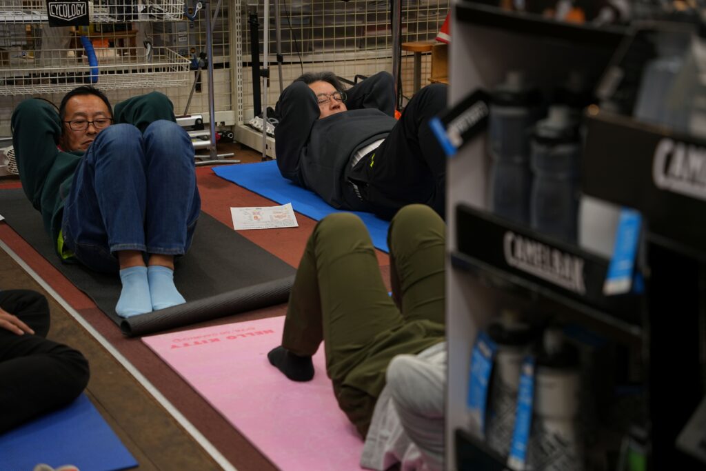 今回の講習会では、ヨガマットを敷いて、実際にご参加いただいた皆様それぞれが身体を動かしながらストレッチを行いました。