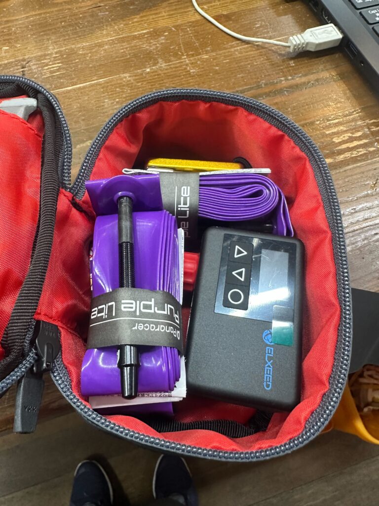 TPUチューブ3本+電動空気入れ+タイヤレバー+マルチツール+鍵 がすっきり収納。