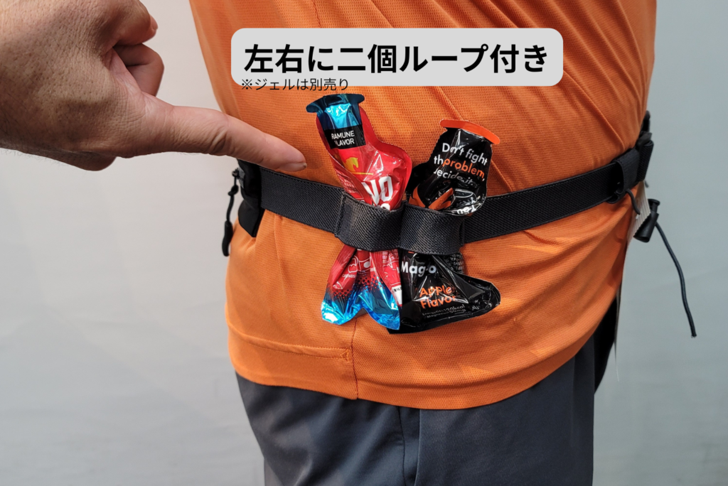 さらに、ポーチとループ(補給食ホルダー)付きなので、スマホや小物、エネルギージェルの携帯もラク。