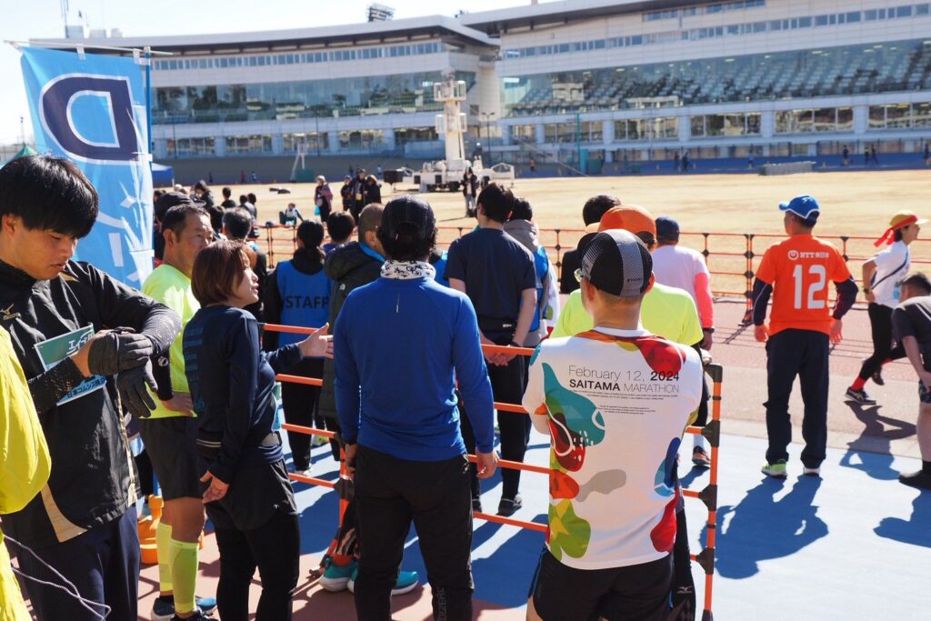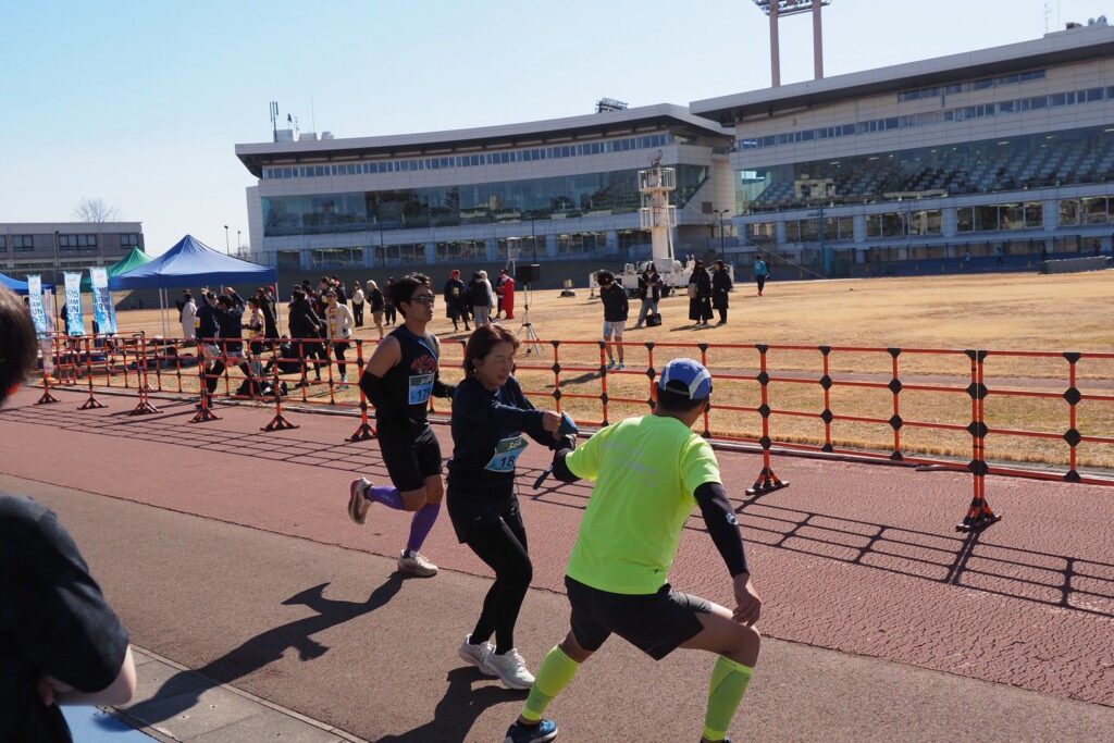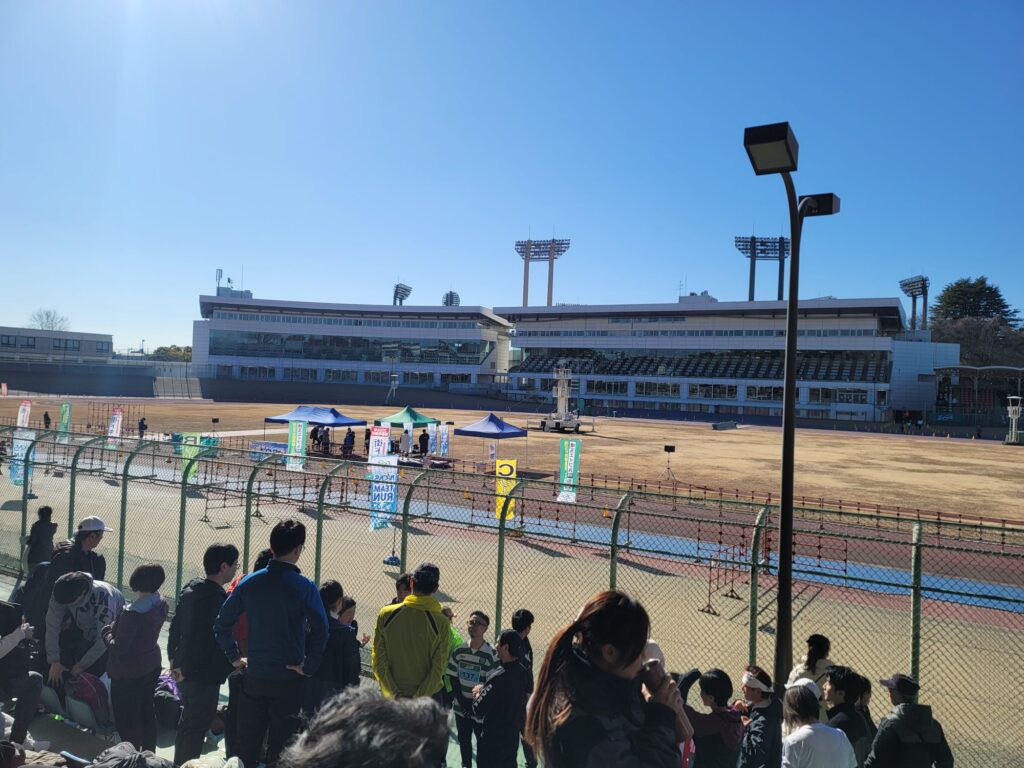 会場内はこんな感じで、大宮競輪場の観客席が控え場所で、競輪場内のトラックがタスキ交換エリア