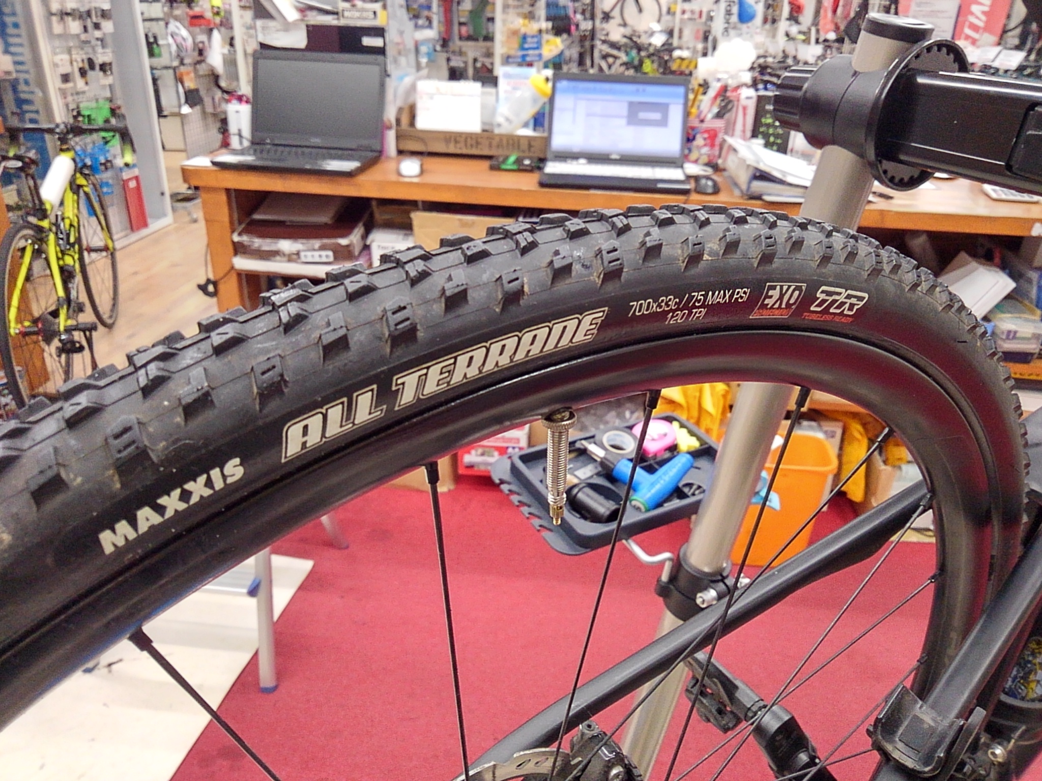 さてさて、ダートを走るとなれば、いくらグラベルロードといえどもブロックタイヤがほしいところ。