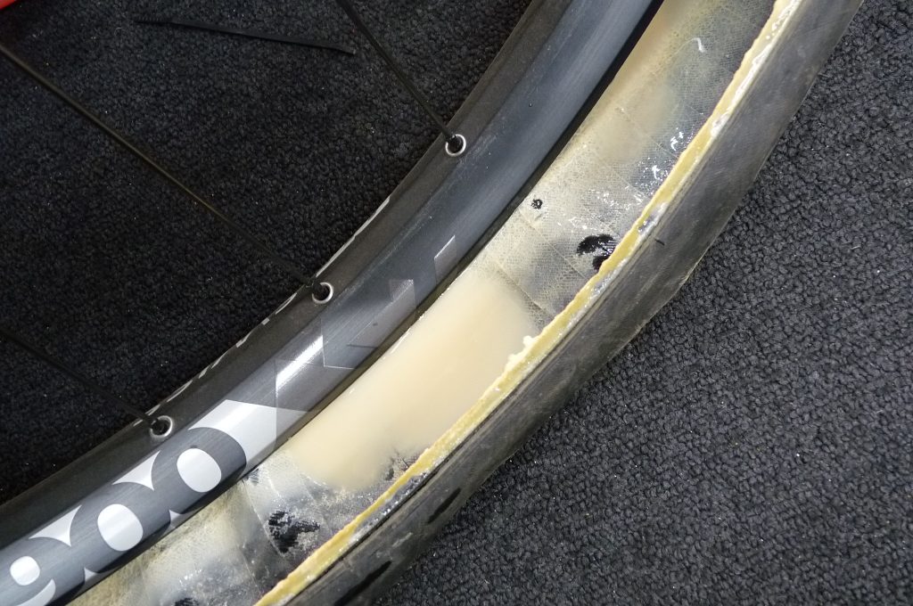 上手くいけばシーラントが一瞬吹きだしたりしてもすぐに止まって塞がる感じですが、ビードの部分から幅広く漏れ出て止まらない事もあります。そうなるとタイヤも外さずにそのまま簡単修理、という訳には行きません。