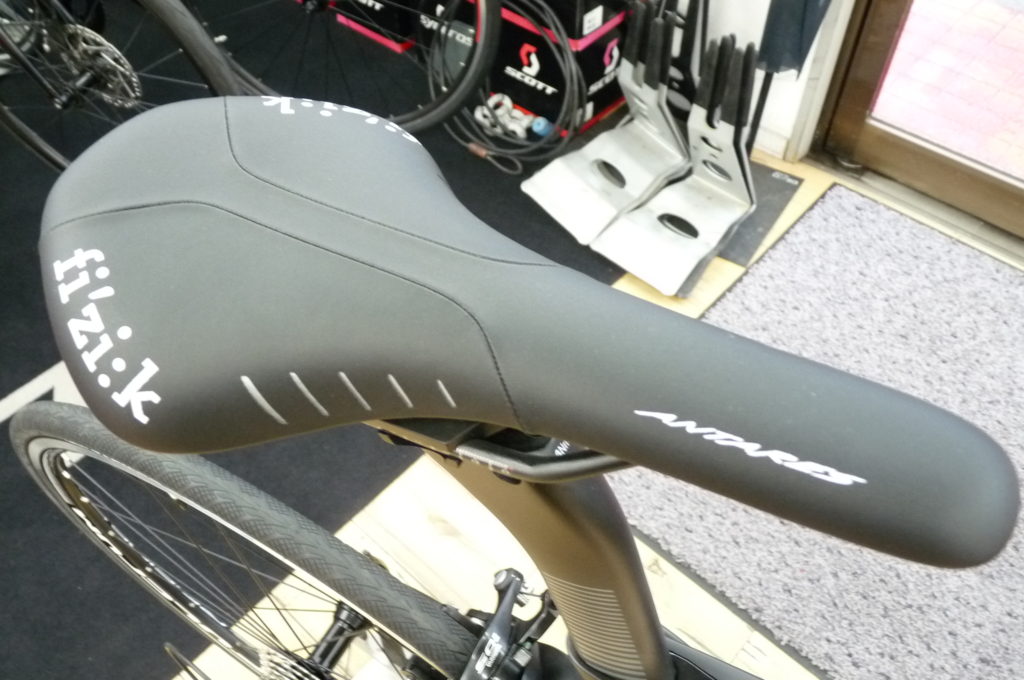 最初からフィジークのアンタレスを装備!コストの抑えどころになりやすくオリジナルのサドルがついてしまう事も完成車では多いですが実用性もありバイクのグレード感もぐっと高まる感じかと思います。