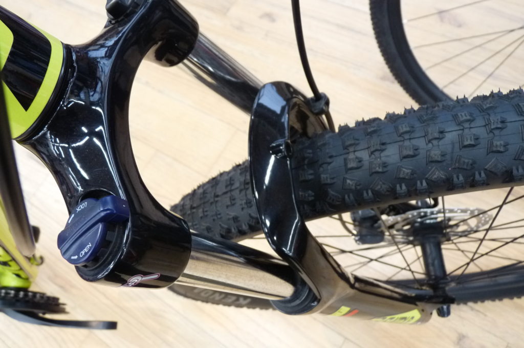 フロントフォークはSRサンツアー製XCT-HLO ストローク100ミリ、フォーク外部にあるレバー操作でロックアウトも可能で登りの立ちコギのような場面では余分な上下動を抑えることができます。